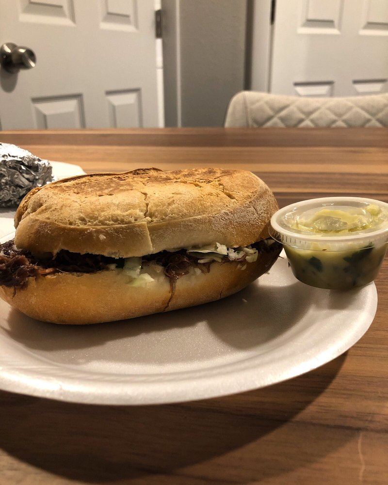 Shredded beef in a spicy green salsa, encased in a handmade corn gordita, typically includes lettuce, sour cream, and Mexican cheese.